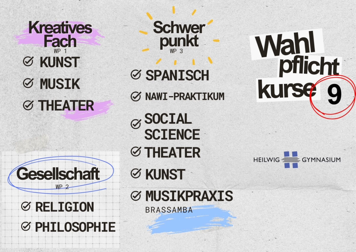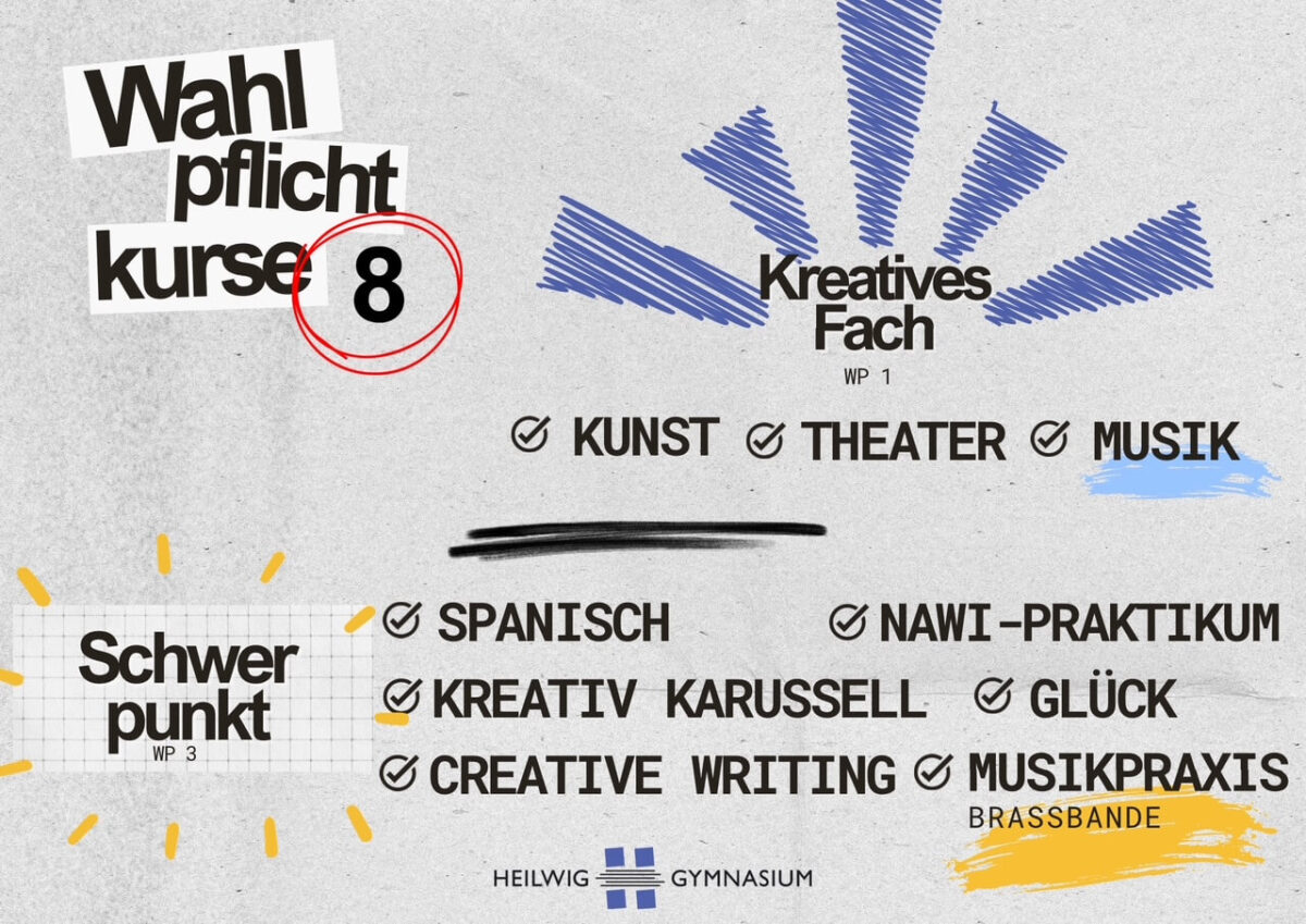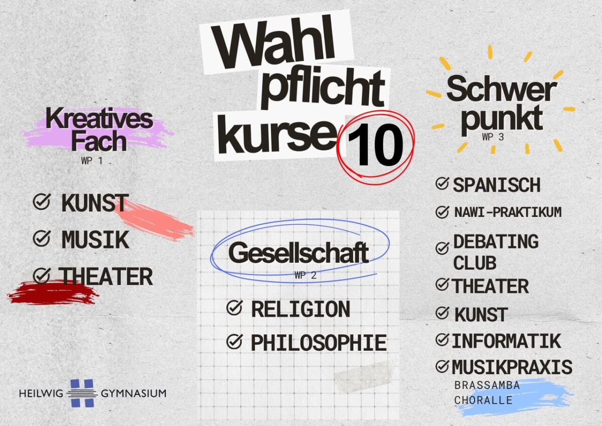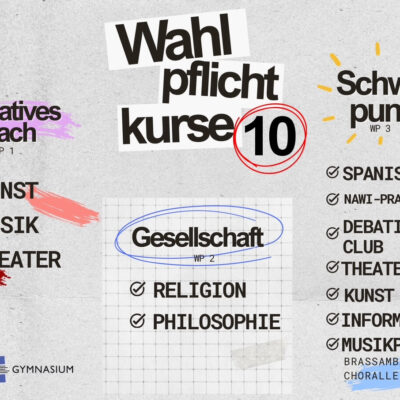 Ab Klassenstufe 8 werden vermehrt Fächer als Wahlpflichtkurse unterrichtet. Die Schülerinnen und Schüler, die in der Pubertät langsam erwachsen werden, bekommen so die Möglichkeit, fachliche Schwerpunkte zu setzen und in anderen sozialen Gruppen diesen Unterricht zu erleben. In den Wahlpflichtbereichen der Jahrgänge 8 und 9-10 zeigen sich die Schwerpunkte der Schule: Naturwissenschaften und Kultur. Zudem gibt es in jedem der drei Jahrgänge ein bilinguales Angebot mit Englisch als Fremdsprache. Eine kurze Übersicht der Kurse findet sich in den folgenden Tabellen, genauere Infos zu den Kursen direkt unter den Tabellen.